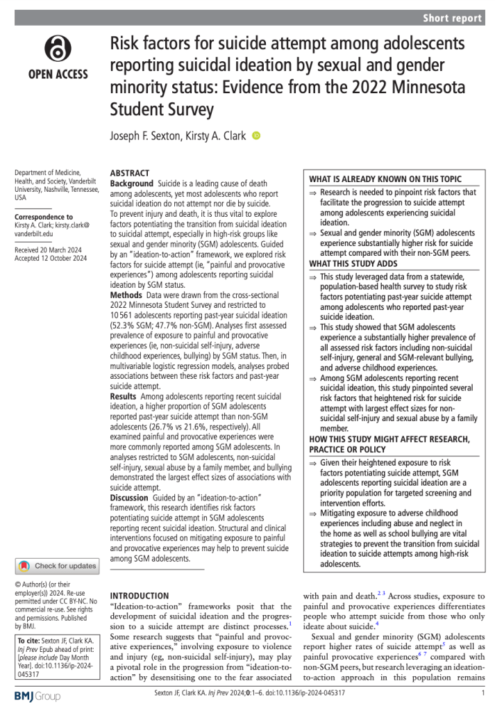 Risk factors for suicide attempt among adolescents reporting suicidal ideation by sexual and gender minority status: Evidence from the 2022 Minnesota Student Survey